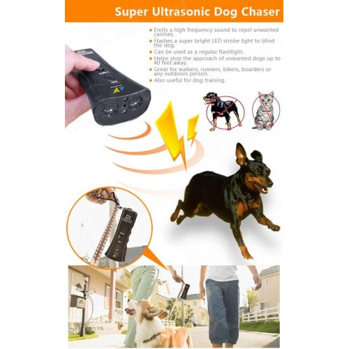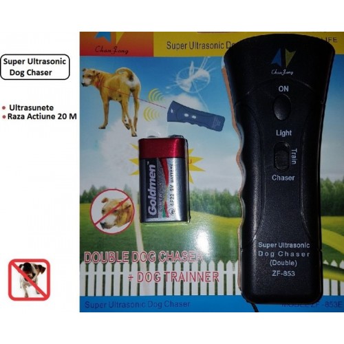 Aparat cu ultrasunete impotriva cainilor Super Ultrasonic Dog Chaser ZF-853E- dispozitivul electric este destinat alungarii si dresarii cainilor, folosind pe lanaga ultrasunete laseriul si lanterna special concepute pentru acest aparat.