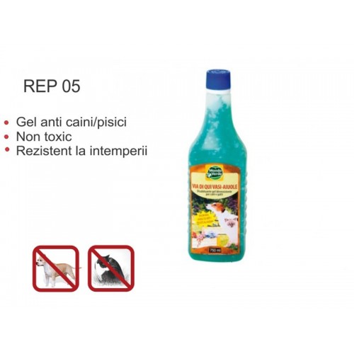 Gel pentru a alunga animalele domestice si salbatice, sub forma de jeleu colorat, aromat cu esente parfumate, rezistent la intemperii si irigatii, pentru toate suprafetele exterioare, cum ar fi: gradini, terenuri, paturi de flori, aranjamente florale, ghivece de flori.