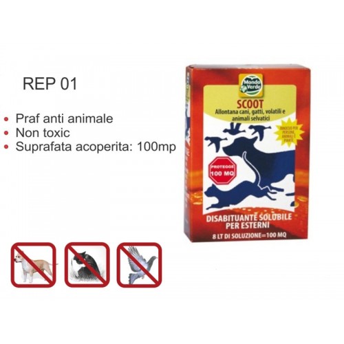 Praf solubil SCOOT pentru a alunga animalele domestice si salbatice, care actioneaza pe cale olfactiva, cu eficienta si economie maxima datorita celor 8 litri de solutie care se pot obtine, suficienti pentru a trata aproximativ 100 metri patrati.